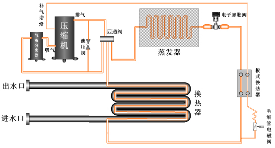 壓縮機(jī)排出的高溫高壓冷媒氣體進(jìn)入換熱器,在換熱器形成熱交換,從而使水溫升高,冷媒冷凝成液態(tài)。然后液態(tài)冷媒經(jīng)膨脹閥節(jié)流降壓后,在蒸發(fā)器中吸收空氣中的熱量從而蒸發(fā)成低溫低壓氣體,又被吸入壓縮機(jī)中壓縮,這樣反復(fù)循環(huán),從而制取熱水。
