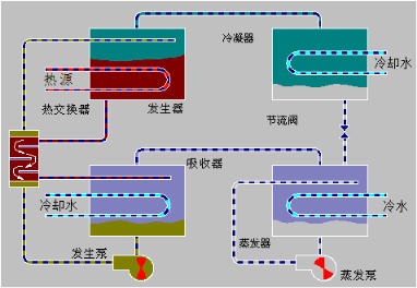 溴化鋰--水吸收式制冷裝置主要由發生器、冷凝器、蒸發器和吸收器4 個部分組成。其基本工作原理如下: