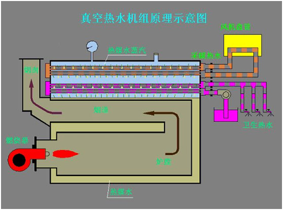 天然氣真空相變鍋爐內采用了汽-水換熱器, 利用相變原理其換熱效率大大高于常壓鍋爐的水-水換熱器。整臺機組由于在真空狀態下運行, 因此徹底避免了常壓鍋爐所存在的爆炸危險,該機組與傳統熱水鍋爐相比,具有無可比擬的易操作性。應用于賓館、酒店、辦公、商住樓等各種場合供暖、衛生熱水的提供。