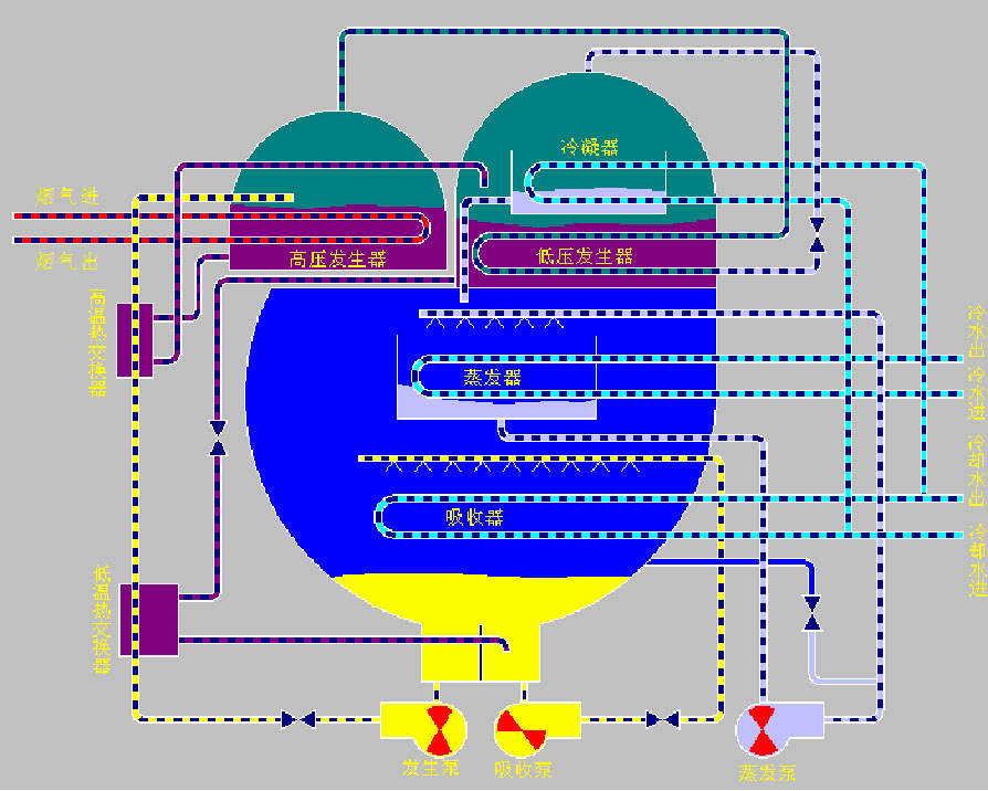 機組主要由高壓發生器、低壓發生器、冷凝器、蒸發器、吸收器、高溫熱交換器以及低溫熱交換器等7個部分組成。